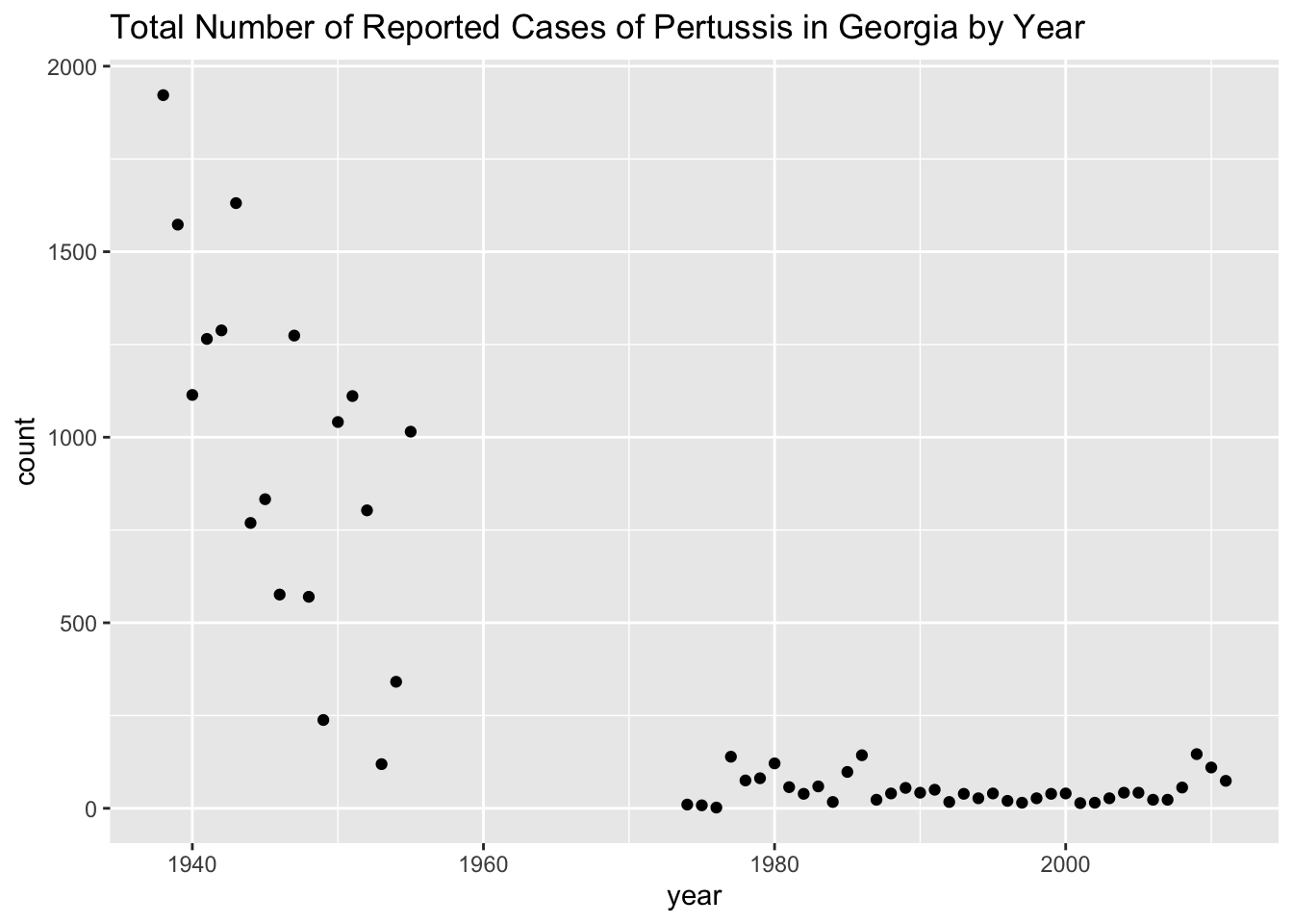 #Assign only Pertussis and Georgia in "us_contagious_diseases" to a new objectgeorgia <-subset(us_contagious_diseases, disease =="Pertussis"& state =="Georgia")#Get an overview of data structure and data summary for "georgia"str(georgia)
