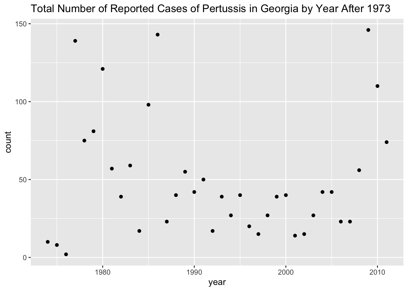 #Plot count as a function of yearggplot(georgia1, aes(x = year, y = count)) +geom_point() +ggtitle("Total Number of Reported Cases of Pertussis in Georgia by Year")