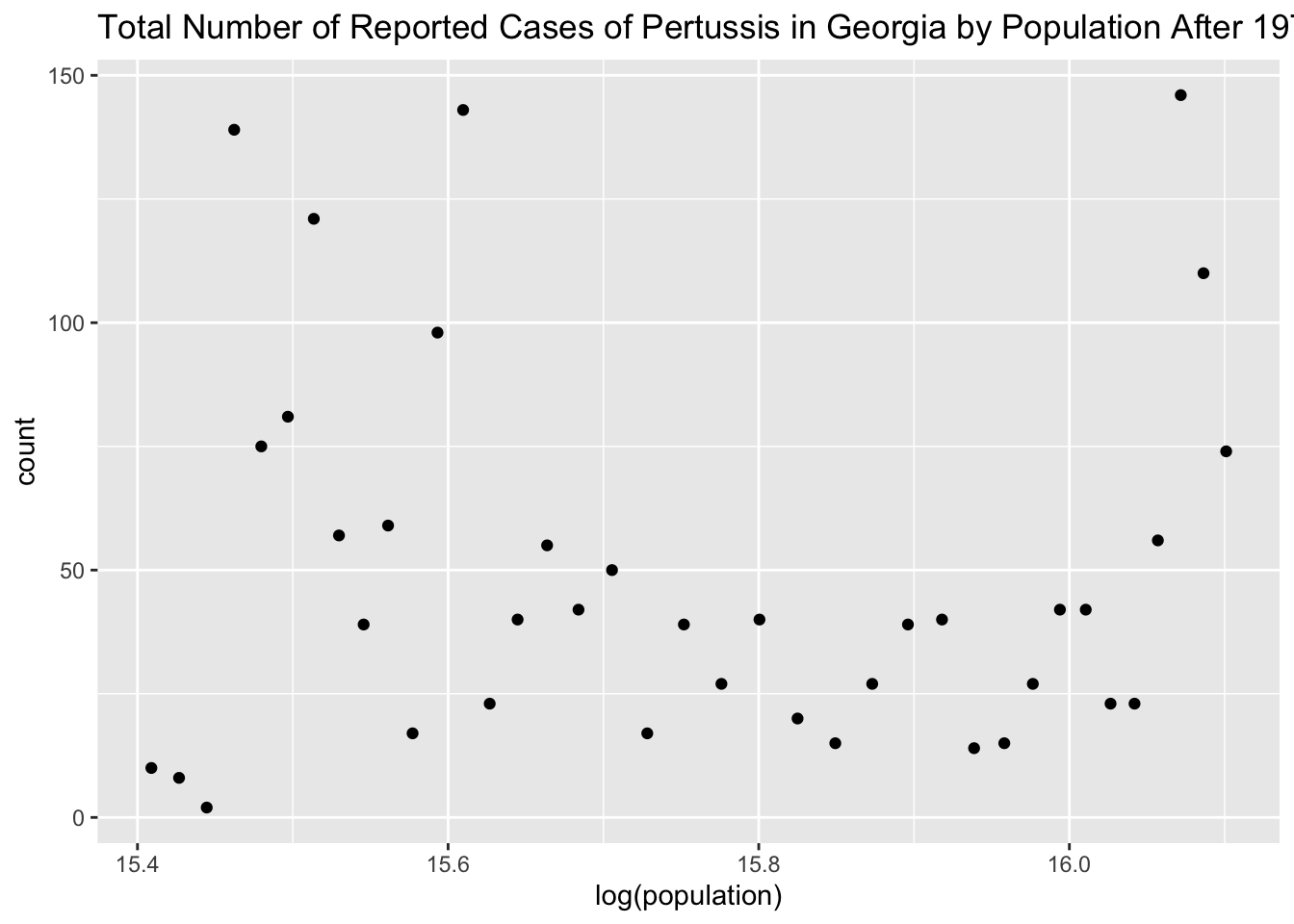 #Plot count as a function of populationggplot(georgia2, aes(x =log(population), y = count)) +geom_point() +ggtitle("Total Number of Reported Cases of Pertussis in Georgia by Population")