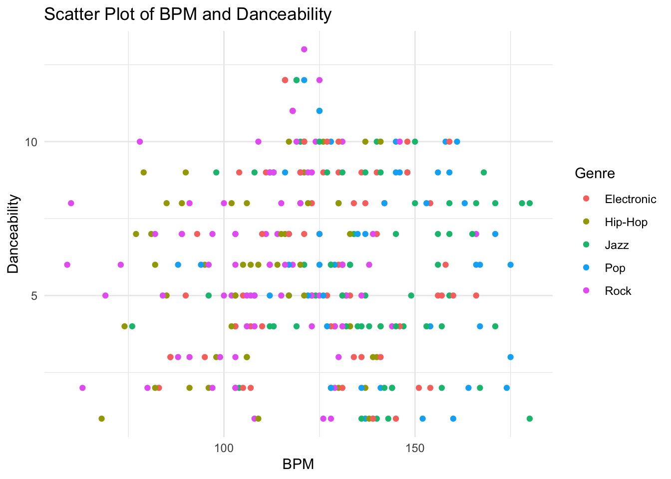 music_data$BPM[rock_indices] <- music_data$BPM[rock_indices] - 10Danceability effects ratings. BPM range effects danceability.