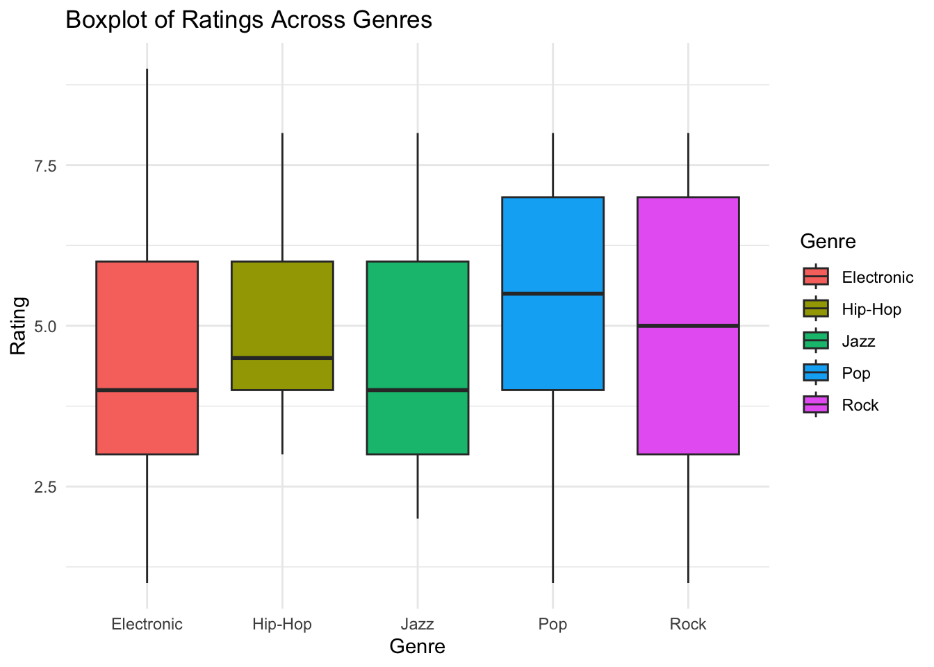 music_data$Genre <- sample(c("Pop", "Rock", "Hip-Hop", "Electronic", "Jazz"), n_songs, replace = TRUE)