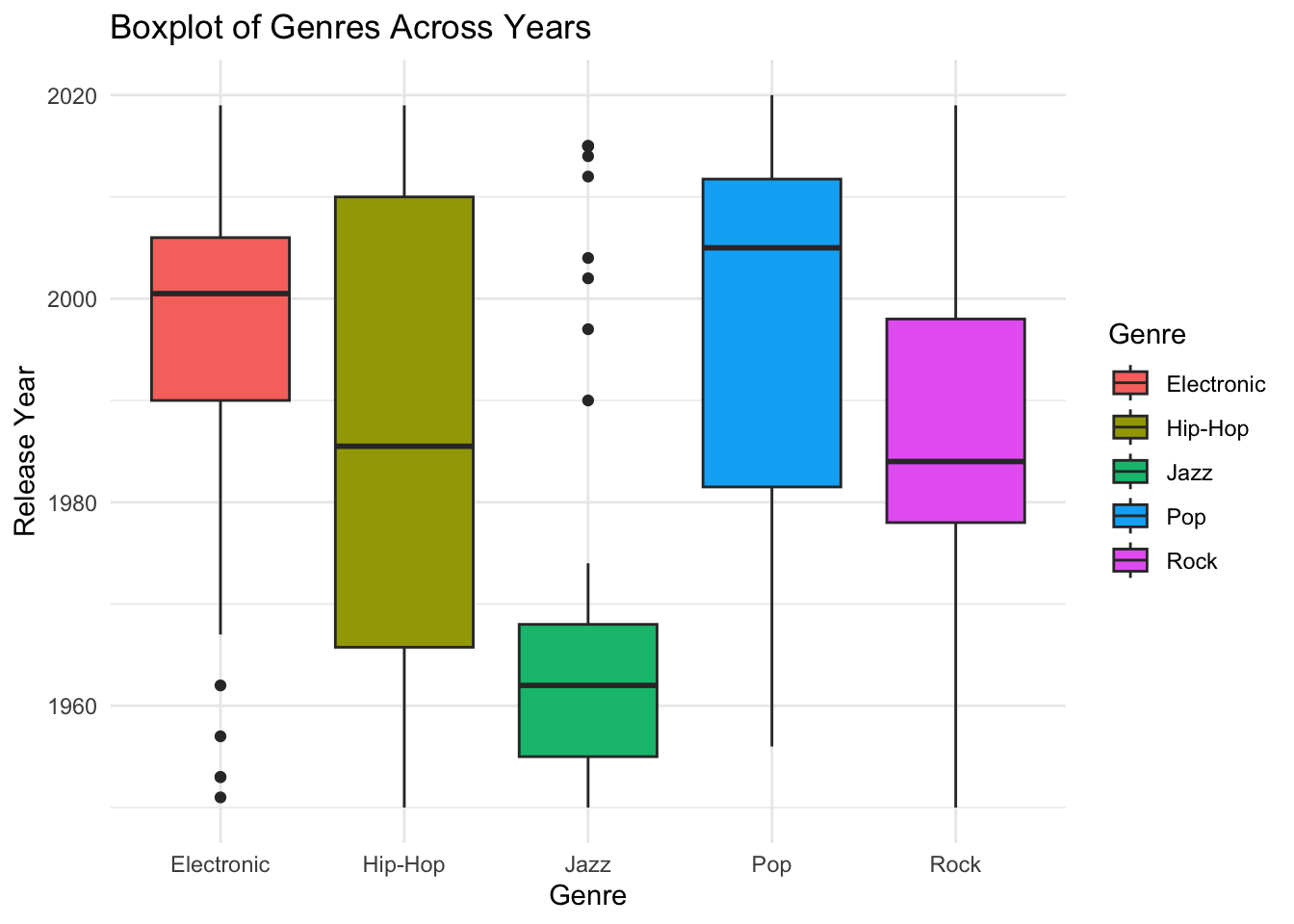 ggplot(music_data, aes(x = Genre, y = ReleaseYear, fill = Genre)) +
