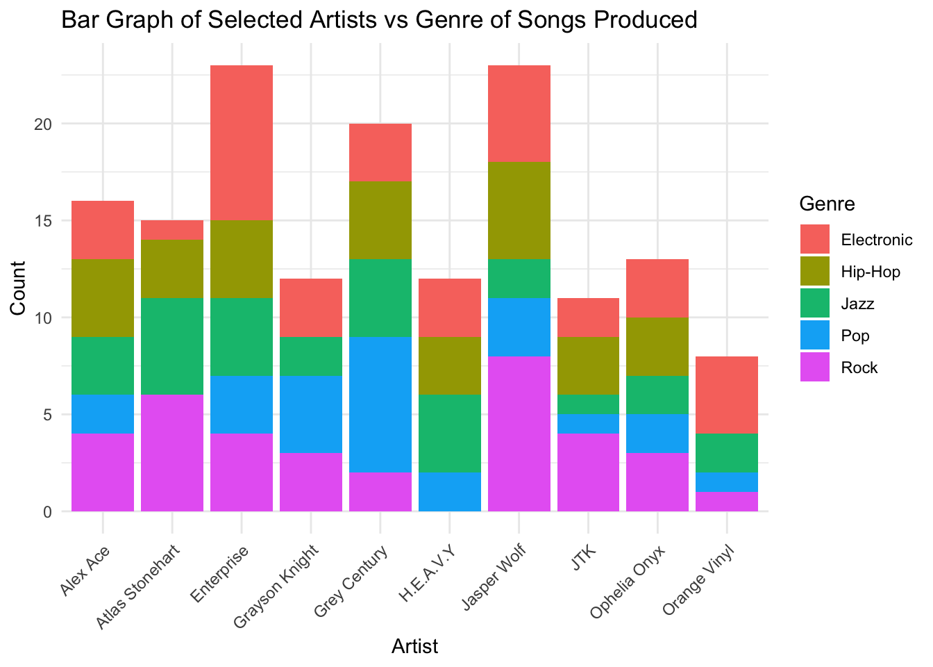 labs(title = "Bar Graph of Selected Artists vs Genre of Songs Produced",